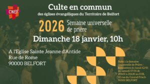 Suite à la Semaine Universelle de Prière, le culte du 18 janvier 2026 sera célébré en commun à l'Eglise Sainte Jeanne d'Antide.